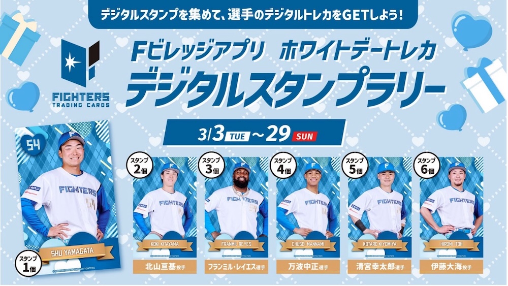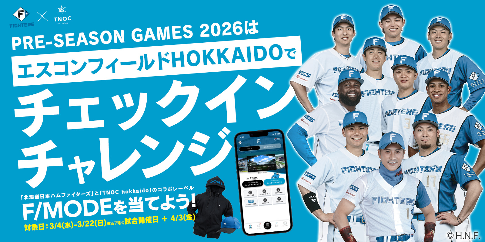 3/4(水)〜4/23(木) 【POP UP】meli melo Burger 2F MAIN LEVEL Sec.222 3/4(水)〜5/3(日) 【POP UP】マルトマ食堂 1F FIELD LEVELワゴン Sec.134 3/4(水)〜6/14(日) 【POP UP】フェルム ラ・テール美瑛 1F FIELD LEVELワゴン Sec.120 3/4(水)〜6/14(日) 【POP UP】幸福中華サワダ 3F STAR LEVEL ワゴン 323B 3/3(火)〜3/29(日) お買い物で限定ステッカープレゼント! 3/3(火)〜3/29(日) 「ホワイトデートレカ」が貰えるスタンプラリー開催! 当日 「TNOC hokkaido ×Fビレッジアプリ」豪華賞品が当たる! 3/4(水)・3/5(木)・3/17(火)・3/18(水) FAV限定「試合前練習見学」 ※事前の申込みが必要です スタジアムツアー開催中! ※各種スケジュールは変更になる場合がございます 試合前 FAV限定「試合前練習見学」 16:00 開場(先行入場15分前) 入場・来場ルール 18:00 試合開始 1回裏 しゃけまるタイム 3回表 リズムゲーム 4回表 きつねダンス 5回裏 YMCA 7回表 ファイターズ讃歌 8回表 スイングタイム 23:15 北広島行き最終シャトルバス新札幌行き最終シャトルバス 詳細はこちら